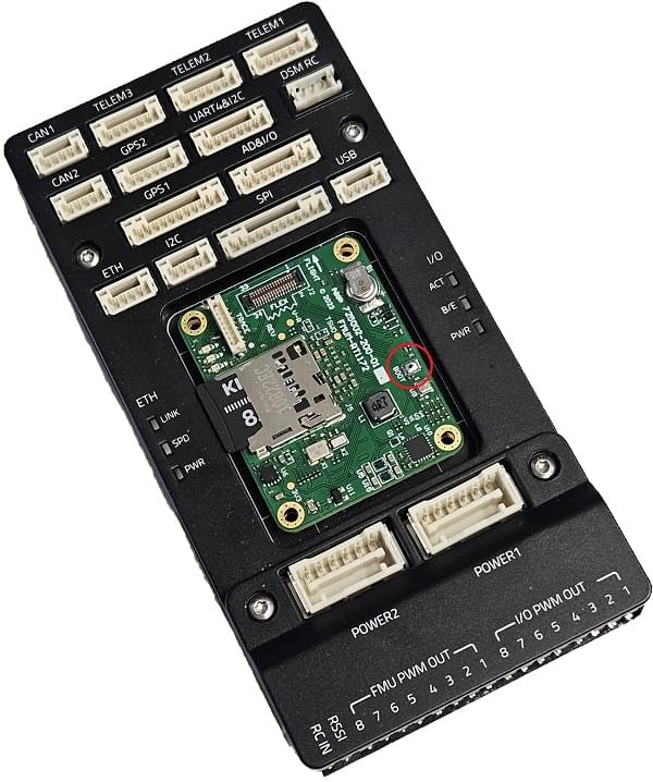 2. If the board is bricked and connecting to QGC is not possible you've open the FMUM module and press the BOOT button (circled in red in the picture below) while powering the board.